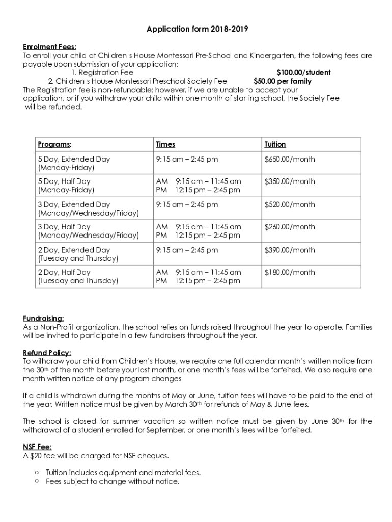 To enroll your child at Children's House Montessori Preschool and Kindergarten, the following fees are