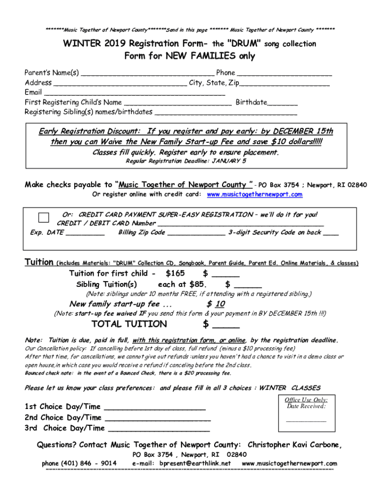 *******Music Together of Newport County*******Send in this page ******* Music Together of Newport County *******WINTER 2019 Registration Form the “DRUM song collection Form for NEW FAMILIES only