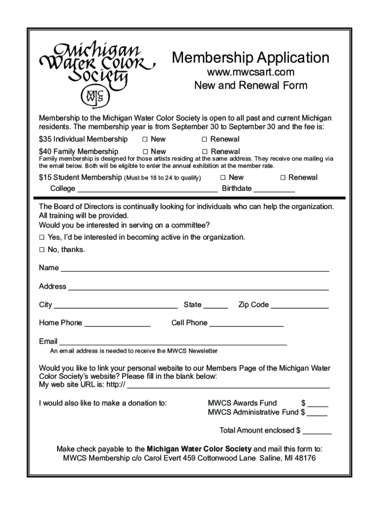 Membership Application www.mwcsart.com New and Renewal FormMembership to the Michigan Water Color Society is open to all past and current Michigan residents. The membership year is from September