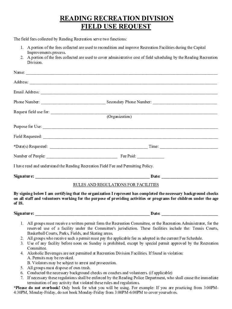READING RECREATION DIVISION FIELD USE REQUEST The field fees collected by Reading Recreation serve two functions: 1. A portion of the fees collected are used to recondition and improve Recreation