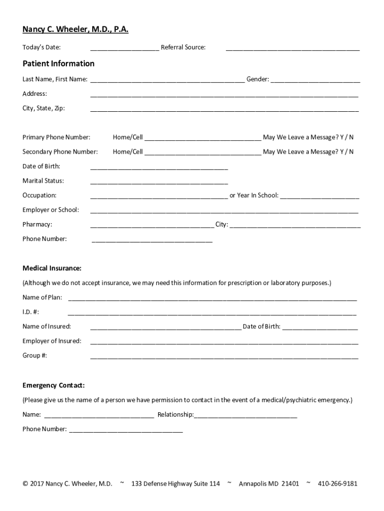Get the free Patient Information Form - Nancy C. Wheeler, MD, PA