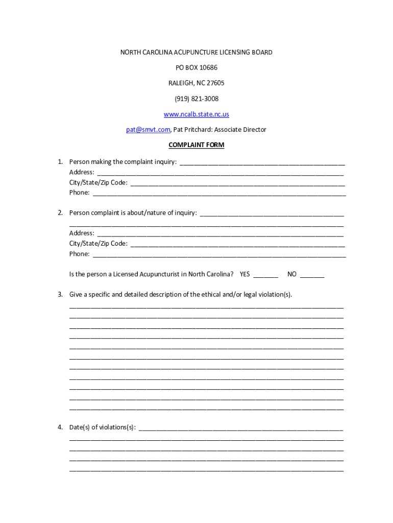 NORTH CAROLINA ACUPUNCTURE LICENSING BOARD PO BOX 10686 RALEIGH, NC 27605 (919) 8213008 www.ncalb.state.nc.us pat smvt.com, Pat Pritchard: Associate Director COMPLAINT FORM 1. Person making the complaint