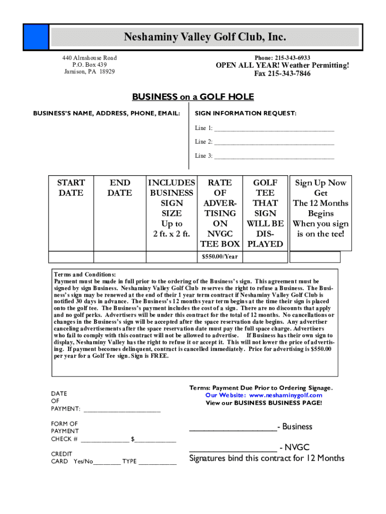 Reshaping Valley Golf Club, Inc. Phone: 2153436933440 Almshouse Road P.O. Box 439 Jamison, PA 18929OPEN ALL YEAR! Weather Permitting! Fax 2153437846BUSINESS on a GOLF HOLE BUSINESS NAME, ADDRESS,