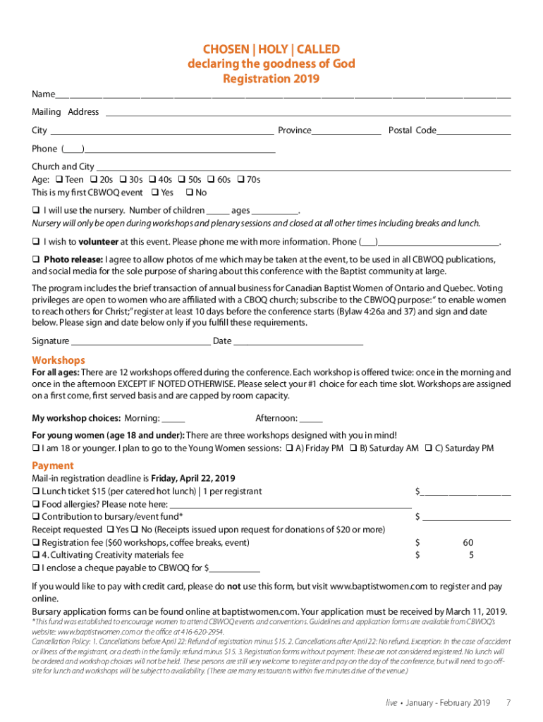 CHOSEN HOLY CALLED declaring the goodness of God Registration 2019 Name Mailing Address City Province Postal Code Phone () Church and City Age: q Teen q 20s q 30s q 40s q 50s q 60s q 70s This is my