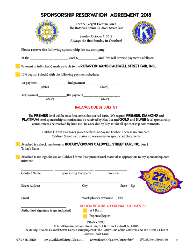 Sponsorship Reservation Agreement 2018 For the Largest Event in Town The Rotary/Kiwanis Caldwell Street Fair Sunday, October 7, 2018Always the first Sunday in October! Please reserve the following