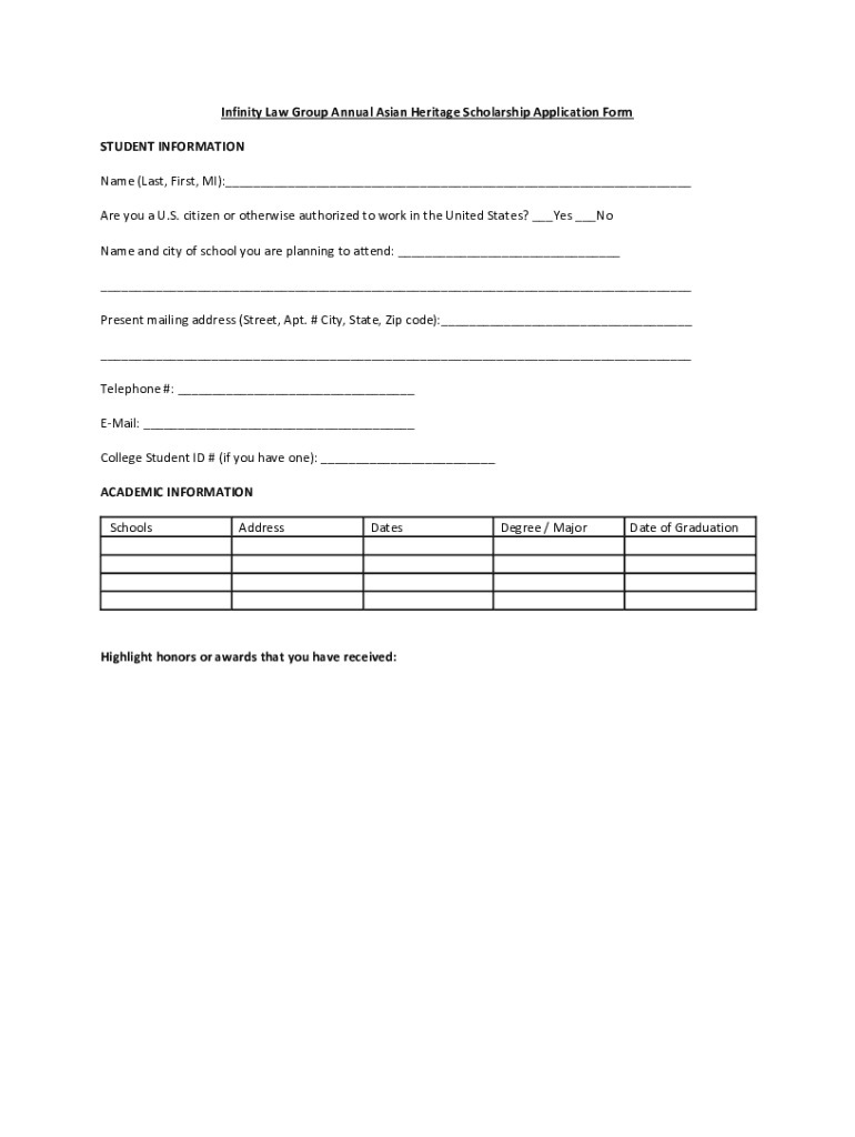 Infinity Law Group Annual Asian Heritage Scholarship Application Form STUDENT INFORMATION Name (Last, First, MI): Are you a U.S. citizen or otherwise authorized to work in the United States? Yes No
