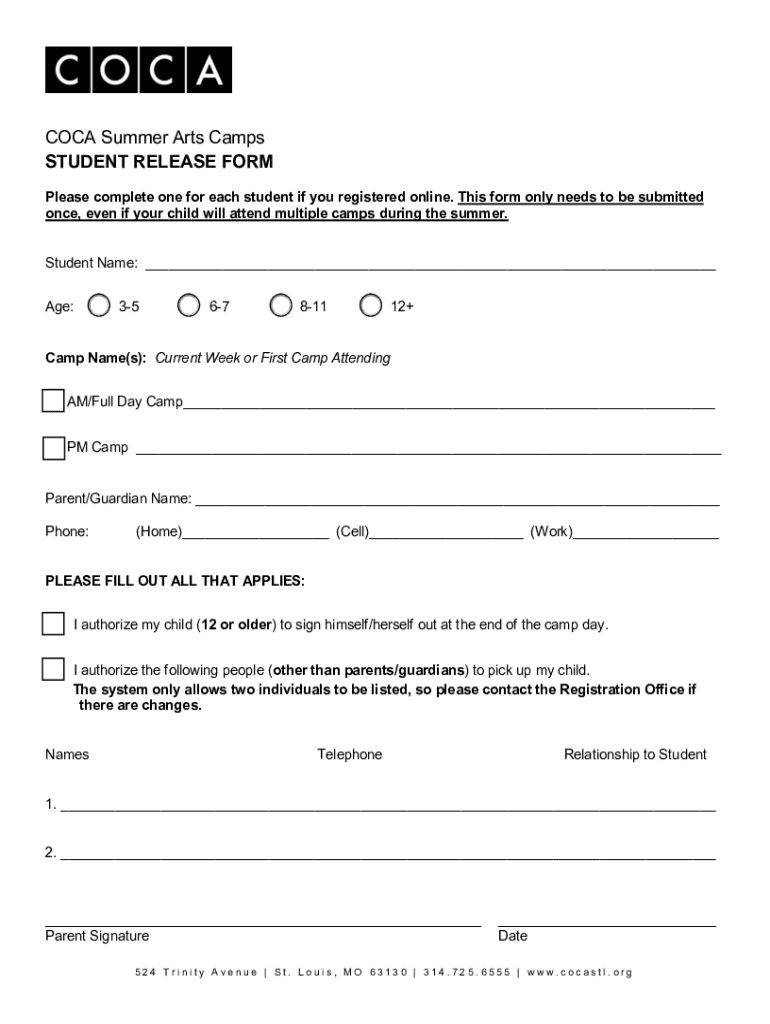 COCA Summer Arts Camps STUDENT RELEASE FORM Please complete one for each student if you registered online. This form only needs to be submitted once, even if your child will attend multiple camps