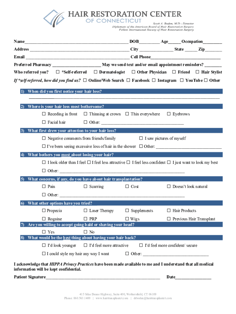 Name DOB Age Occupation Address City State Zip Email Cell Phone Preferred Pharmacy May we send text and/or email appointment reminders? *Self referred Dermatologist Other Physician Friend Hair Stylist