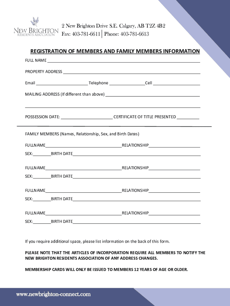 2 New Brighton Drive S.E. Calgary, AB T2Z 4B2 Fax: 4037816611 Phone: 4037816613REGISTRATION OF MEMBERS AND FAMILY MEMBERS INFORMATION FULL NAME PROPERTY ADDRESS Email Telephone Cell MAILING ADDRESS
