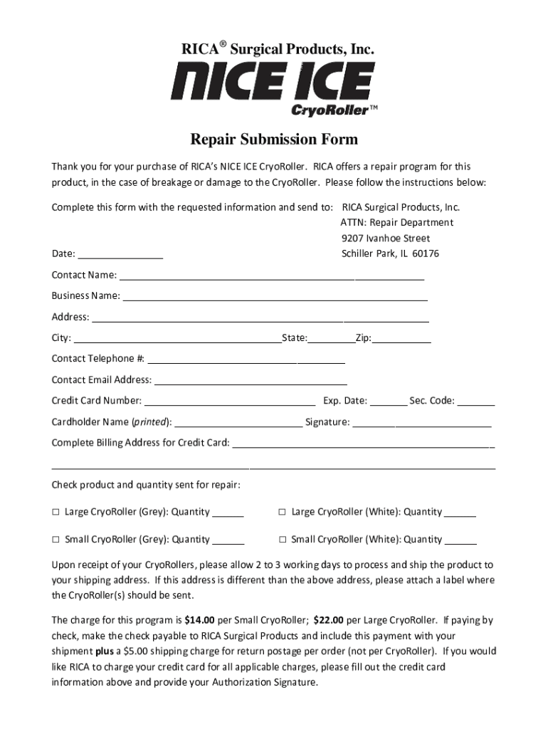 Get the free Repair Submission Form - NICE ICE CryoRoller