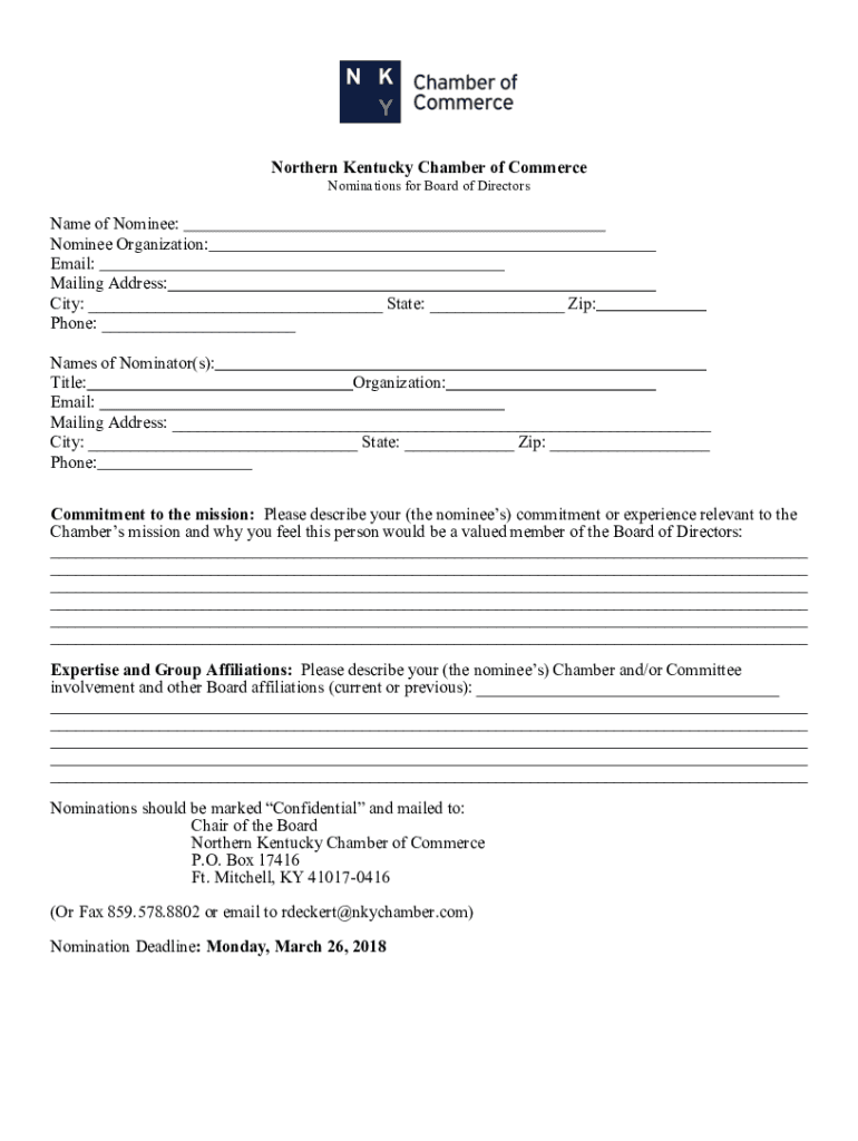 Northern Kentucky Chamber of Commerce Nominations for Board of Directorate of Nominee: Nominee Organization: Email: Mailing Address: City: State: Zip: Phone: Names of Nominator(s): Title: Organization: