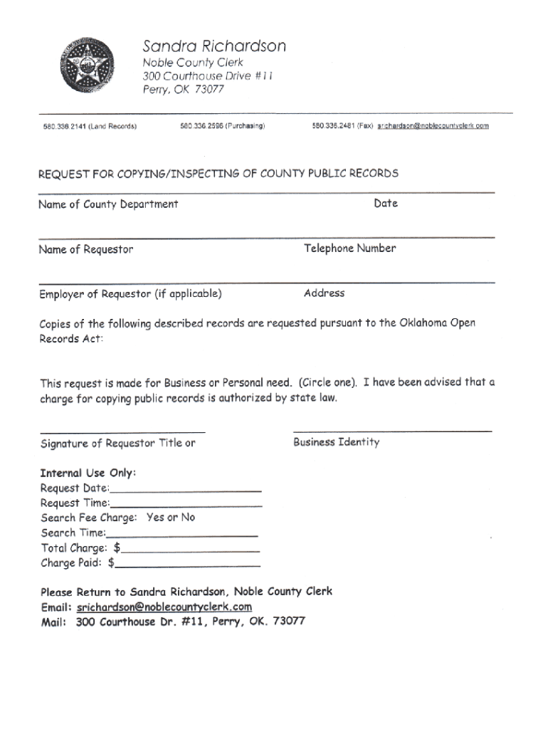 Perry, OK 73077580.336.2141 (Land Records)580 .336 .2596 (Purchasing)580.336 .2481 (Fax) srichardson@noblecountyclerk.request FOR COPYING/