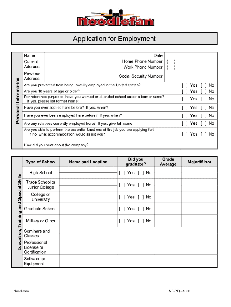 Application for EmploymentPersonal Informational Current Addressable Home Phone Number (Work Phone Number (Previous Address))Social Security Number Yes No Yes Are you prevented from being lawfully