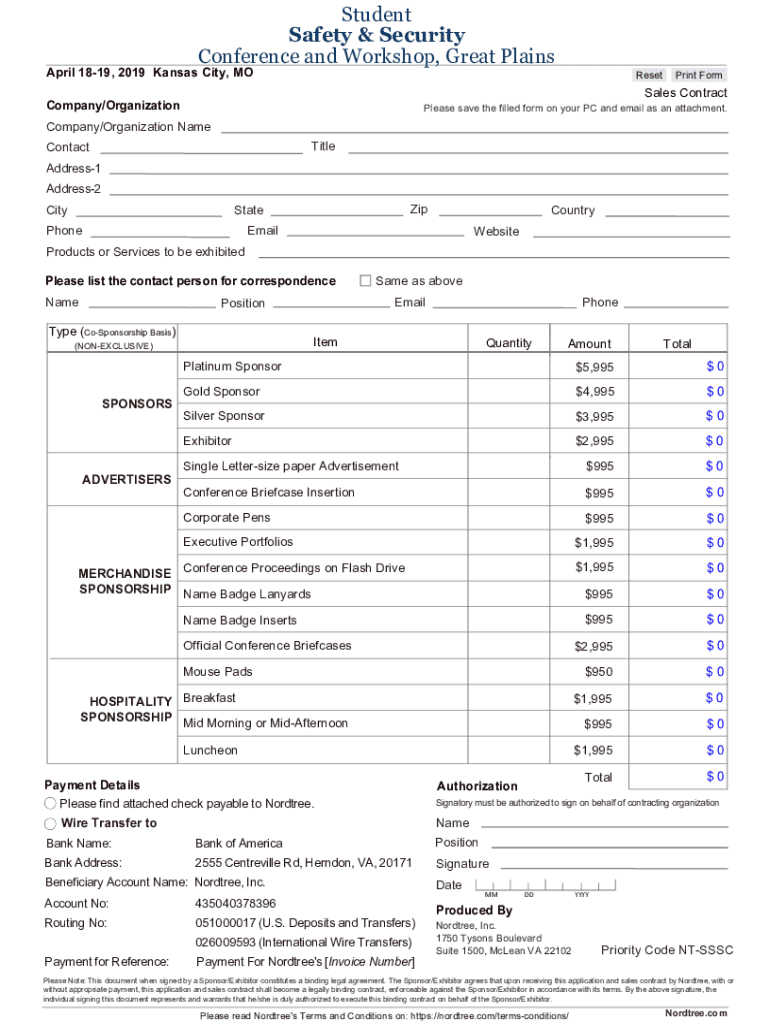 Student Safety & Security Conference and Workshop, Great Plains April 1819, 2019 Kansas City, MOResetPrint Form Sales ContractCompany/OrganizationPlease save the filled form on your PC and email as
