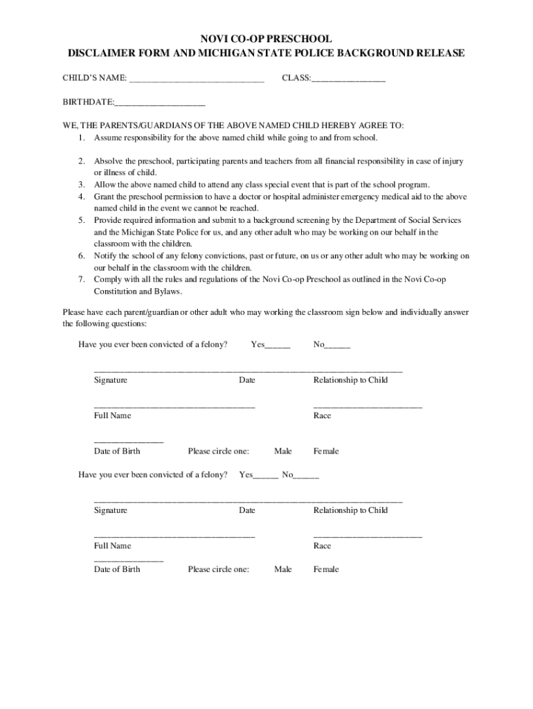 NOVA COOP PRESCHOOL DISCLAIMER FORM AND MICHIGAN STATE POLICE BACKGROUND RELEASE CHILD NAME: CLASS: BIRTHDATE: WE, THE PARENTS/GUARDIANS OF THE ABOVE NAMED CHILD HEREBY AGREE TO: 1. Assume responsibility