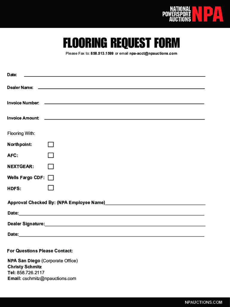 FLOORING REQUEST FORM Please Fax to: 858.513.1599 or email pact auctions.combat: Dealer Name: Invoice Number: Invoice Amount:Flooring With: North point: AFC: NETGEAR: Wells Fargo CDF: HFS: Approval