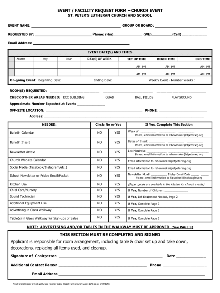 EVENT / FACILITY REQUEST FORM CHURCH EVENT ST. PETERS LUTHERAN CHURCH AND SCHOOL EVENT NAME:GROUP OR BOARD:REQUESTED BY:Phone: (Hm)(Wk) (Cell) Email Address: EVENT DATE(S) AND TIMES MonthDayYearDAY(S)