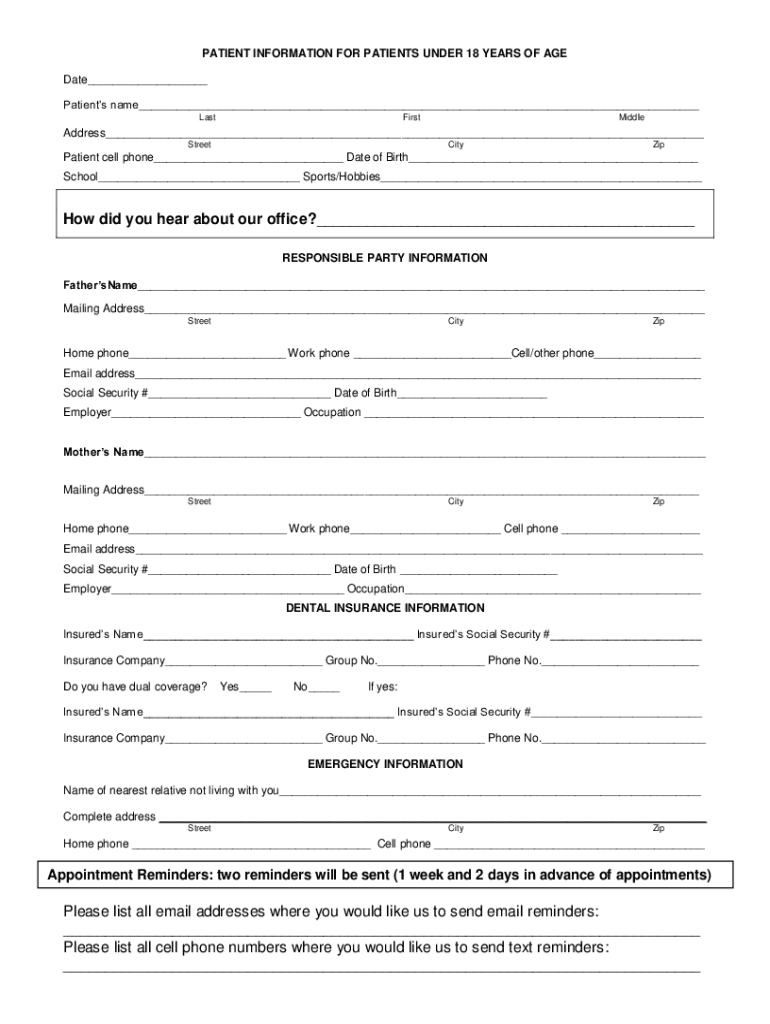 PATIENT INFORMATION FOR PATIENTS UNDER 18 YEARS OF AGE Date Patients name LastFirstMiddleAddress StreetCityZipPatient cell phone Date of Birth School Sports/Hobbies How did you hear about our office?