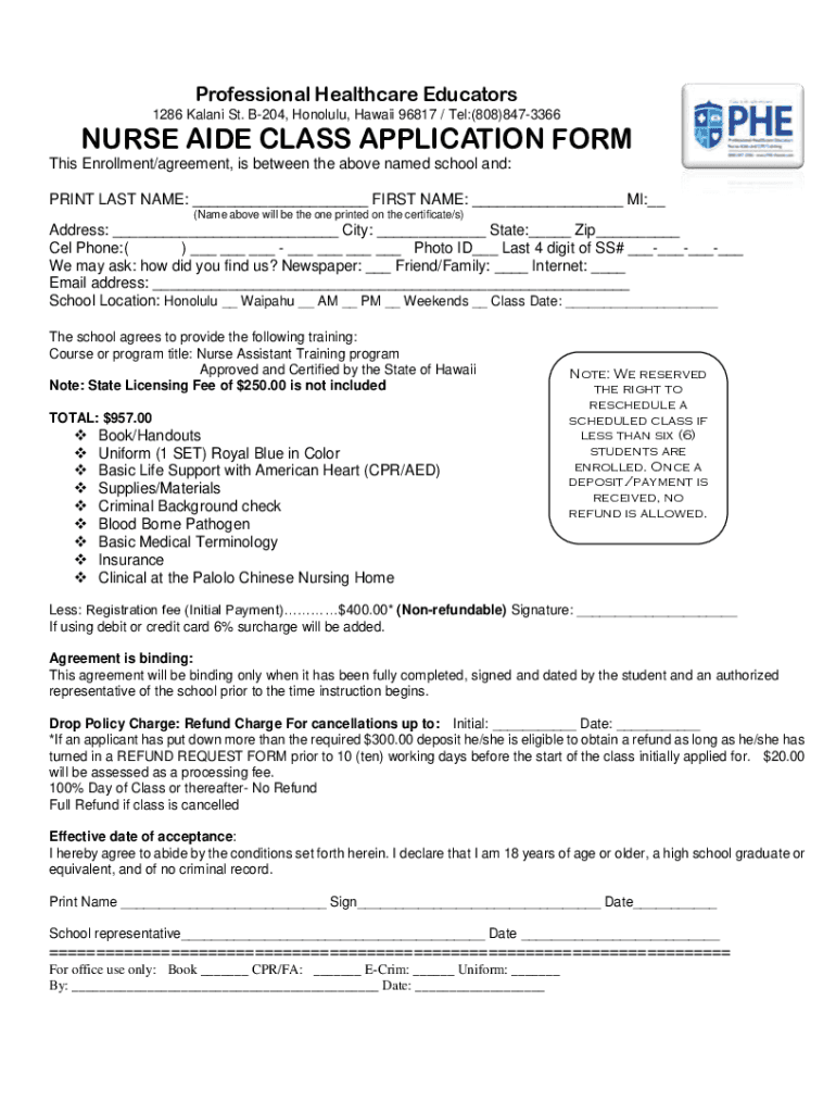 Get the free NURSE AIDE CLASS APPLICATION FORM - phe-hawaii.com