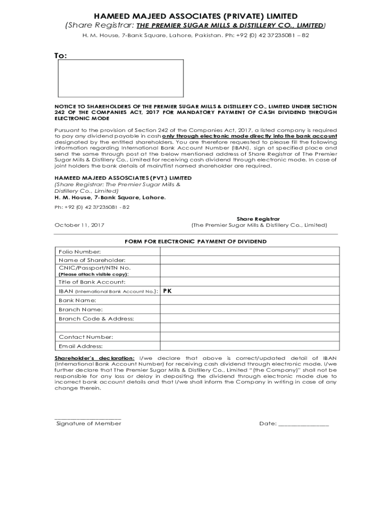 HAMMED MAJ EED ASSOCIATES (PRIVATE) LIMITED (Share Registrar: THE PREMIER SUGAR MILLS & DISTILLERY CO., LIMITED) H. M. House, 7Bank Square, Lahore, Pakistan. PH: +92 (0) 42 37235081 82To:NOTICE TO