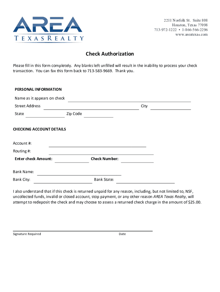 2211 Norfolk St. Suite 808 Houston, Texas 77098 7139721222 18665662296 www.areatexas.comCheck AuthorizationPlease fill in this form completely. Any blanks left unfilled will result in the inability