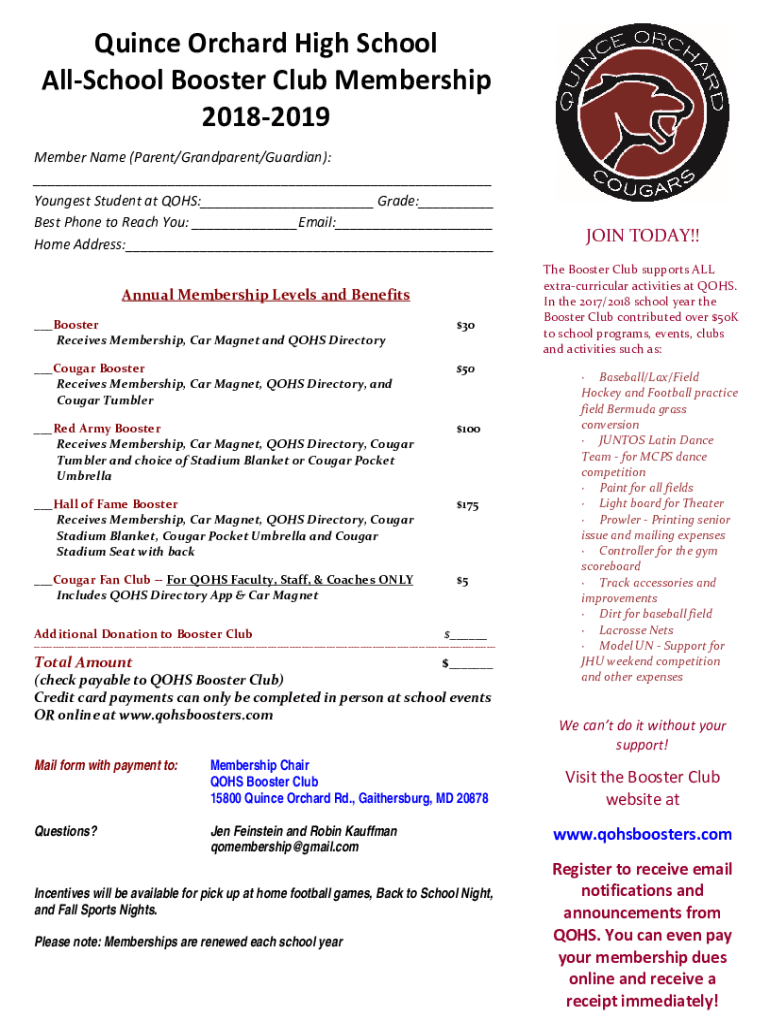 Quince Orchard High School Booster Club Membership 20182019 Member Name (Parent/Grandparent/Guardian): Youngest Student at OOHS: Grade: Best Phone to Reach You: Email: Home Address: Annual Membership
