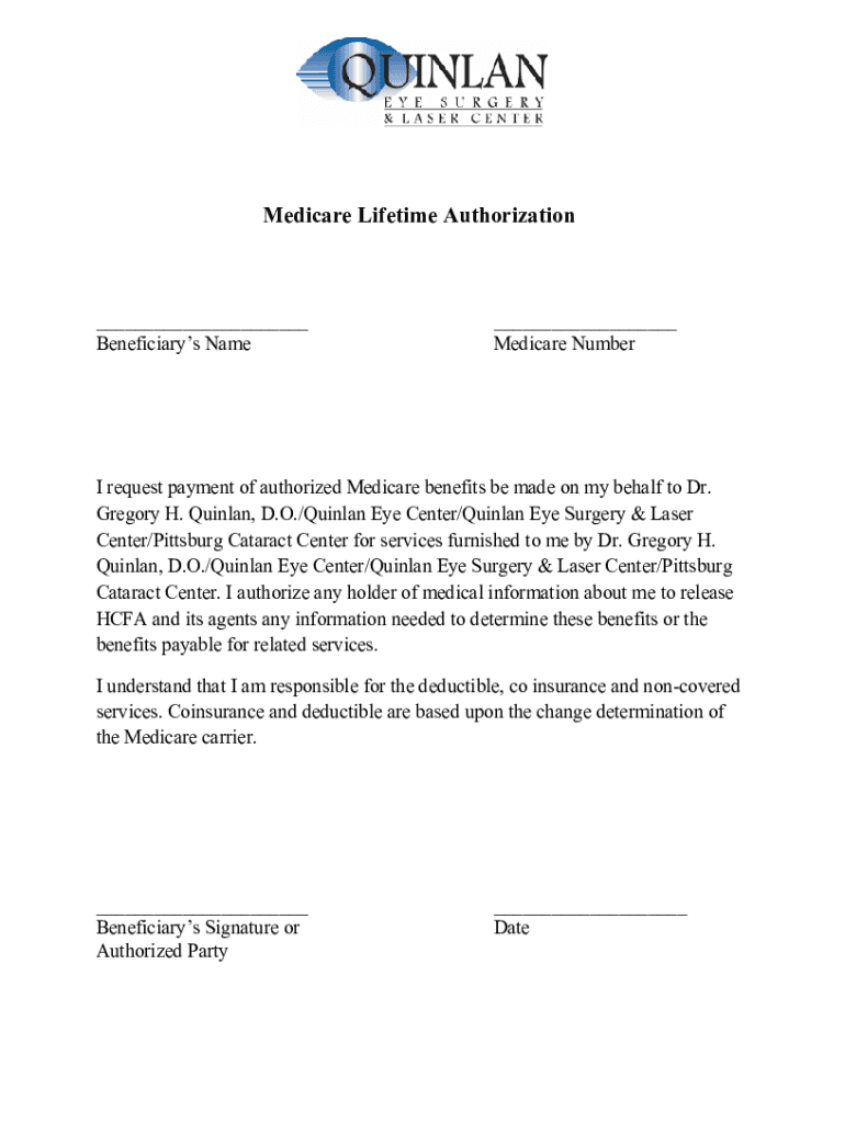 Medicare Lifetime Authorization Beneficiaries Name Medicare Number request payment of authorized Medicare benefits be made on my behalf to Dr. Gregory H. Quinn, D.O./Quinn Eye Center/Quinn Eye Surgery