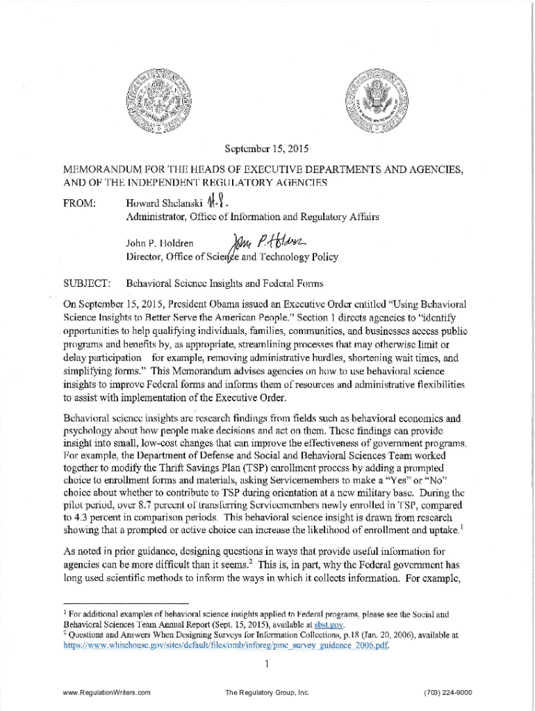 September 15, 2015, MEMORANDUM FOR THE HEADS OF EXECUTIVE DEPARTMENTS AND AGENCIES, AND OF THE INDEPENDENT REGULATORY AGENCIES FROM:Howard Polanski. Administrator, Office of Information and Regulatory