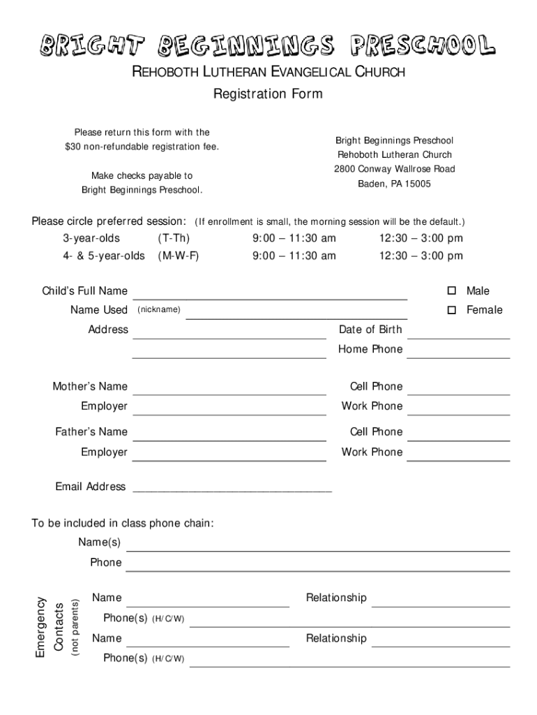 ROBOT LUTHERAN EVANGELICAL CHURCH Registration Form Please return this form with the $30 nonrefundable registration fee. Bright Beginnings Preschool Robot Lutheran Church 2800 Conway Wall rose Road