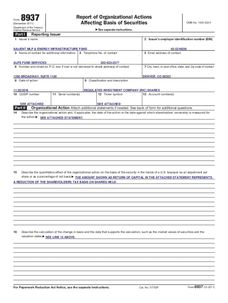8937Report of Organizational Actions Affecting Basis of SecuritiesForm (December 2011) Department of the Treasury Internal Revenue Serviceman Ia See OMB No. 15452224separate instructions. Reporting
