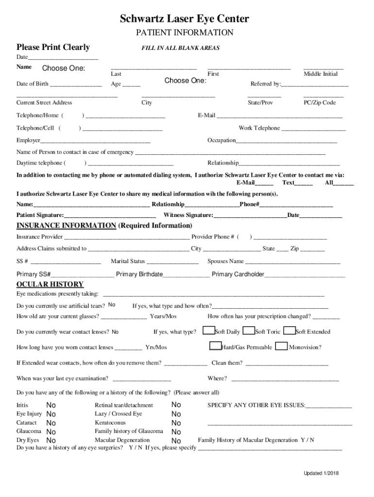 Schwartz Laser Eye Center PATIENT INFORMATION Please Print Clear-fell IN ALL BLANK Predate Name Mr. Mrs. Ms. Miss Choose One: FirstLastDate of Birth Current Street Address Telephone/Home (Telephone/Cell