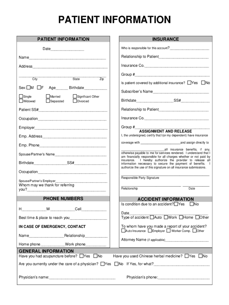 PATIENT INFORMATION PATIENT INFORMATIONINSURANCEDate Who is responsible for this account? Name Relationship to Patient Address Insurance Co. Group # CityStateZipYesIs patient covered by additional