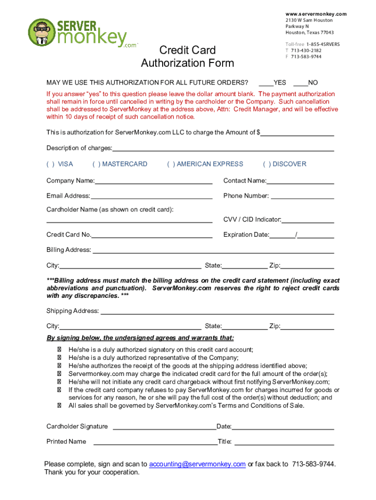 WWW.servermonkey.com 2130 W Sam Houston Parkway N Houston, Texas 77043 Toll free 18554SRVERS T 7134302182 F 7135839744Credit Card Authorization Form MAY WE USE THIS AUTHORIZATION FOR ALL FUTURE ORDERS?