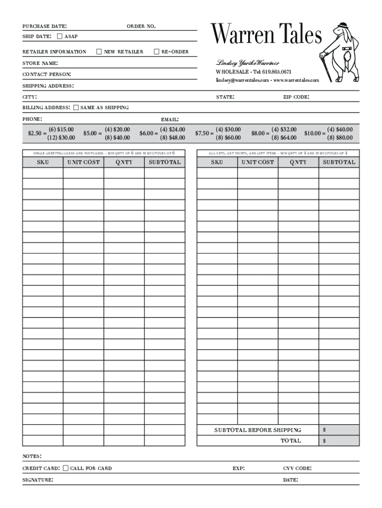 Purchase date: ship date:order no.asap retailer informationreordernew retailer Warren Tales store name:Lindsey Yumiko Warrinercontact person:Wholesale Tel: 619.865.0671 Lindsey warrentales.com www.warrentales.comshipping