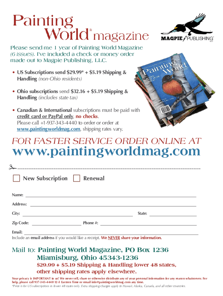 MAGPIE PUBLISHINGLLCPlease send me 1 year of Painting World Magazine (6 issues). I've included a check or money order made out to Magpie Publishing, LLC.MAGPIEPUBLISHINGLLCMAGPIE PUBLISHING US Subscriptions