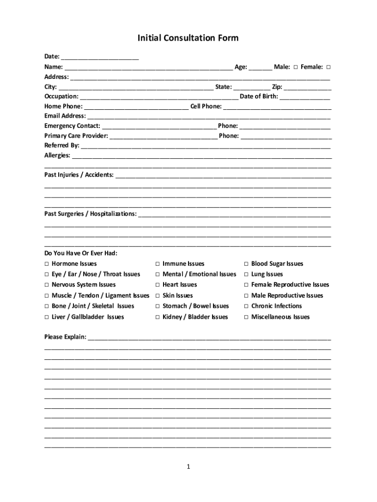 InitialConsultationForm Date: Name: Age: Male:Female: Address: City: State: Zip: Occupation: DateofBirth: Homophone: Cellphone: Misaddress: EmergencyContact: Phone: PrimaryCareProvider: Phone: Referred: