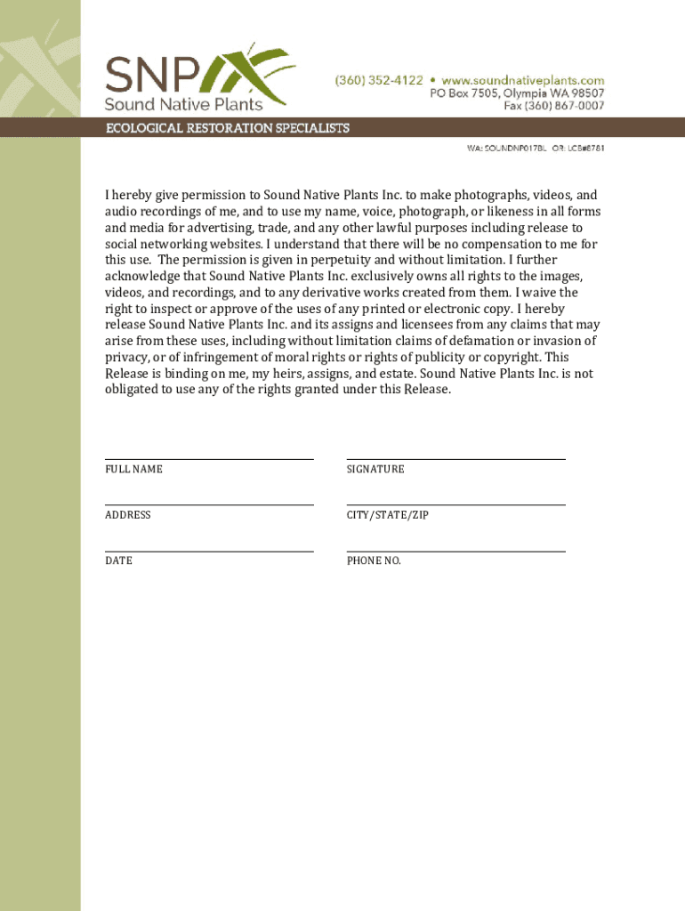 Get the free I hereby give permission to Sound Native Plants Inc. to make ...