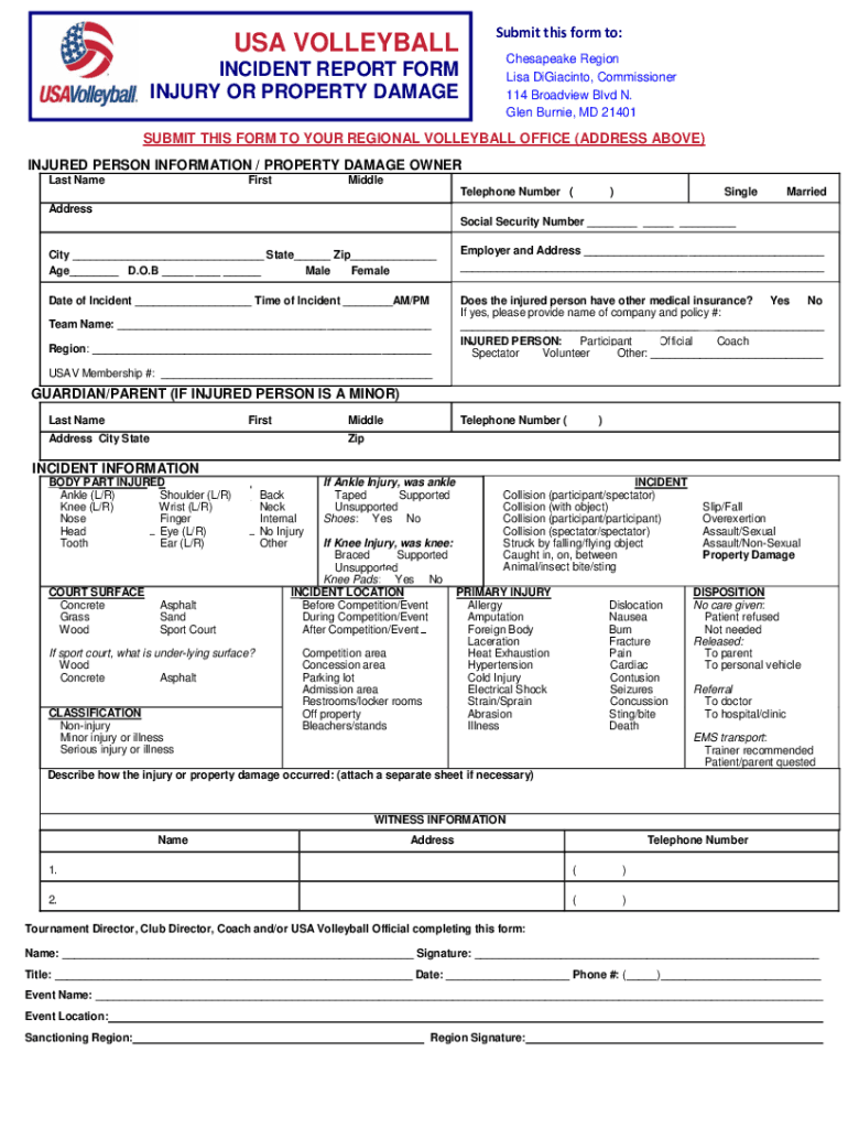 Submit this form to:USA VOLLEYBALL Chesapeake Region Lisa DiGiacinto, Commissioner 114 Broadview Blvd N. Glen Burnie, MD 21401INCIDENT REPORT FORM INJURY OR PROPERTY DAMAGESUBMIT THIS FORM TO YOUR