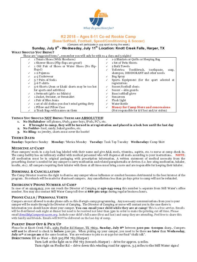 What do you thirst for? R2 2018 Ages 811 Coed Rookie Camp (Base/Softball, Football, Speed/Conditioning & Soccer) (Campers will participate in one sport during the week)Sunday, July 8th Wednesday,