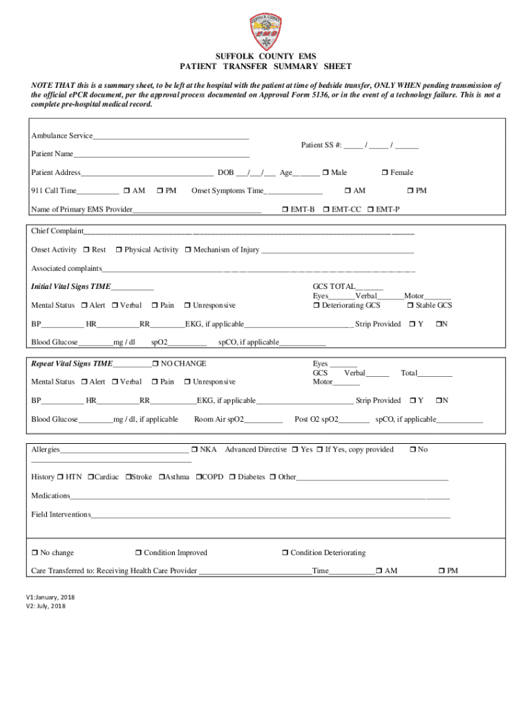 SUFFOLK COUNTY EMS PATIENT TRANSFER SUMMARY SHEET NOTE THAT this is a summary sheet, to be left at the hospital with the patient at time of bedside transfer, ONLY WHEN pending transmission of the