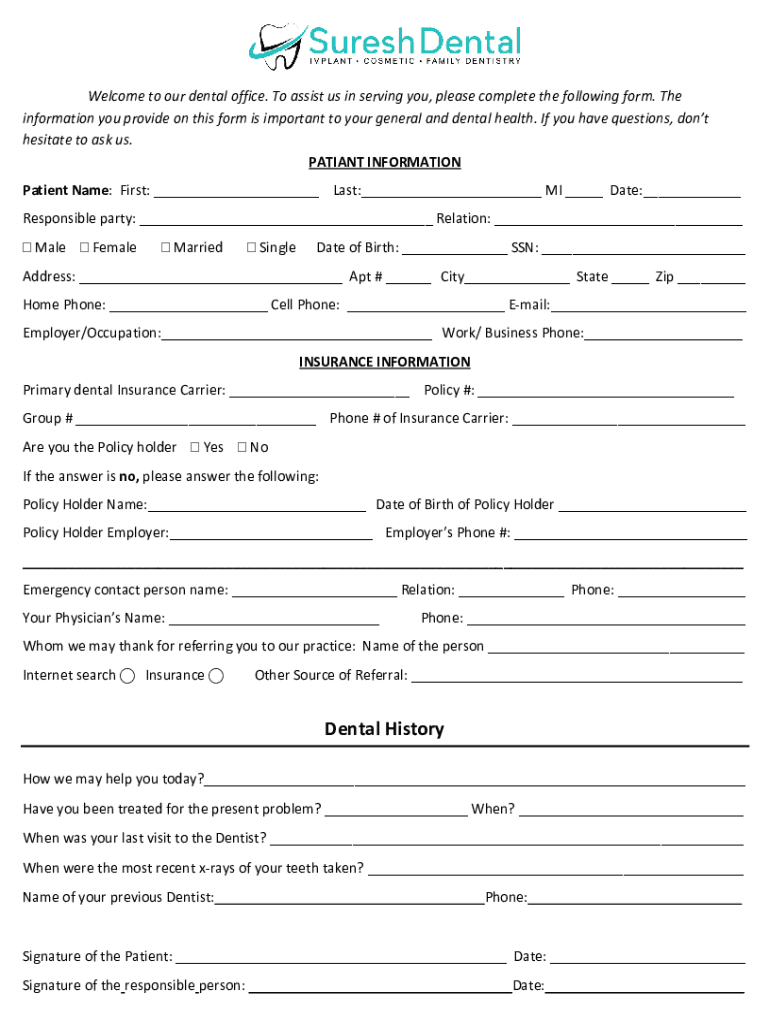Welcome to our dental office. To assist us in serving you, please complete the following form. The information you provide on this form is important to your general and dental health. If you have