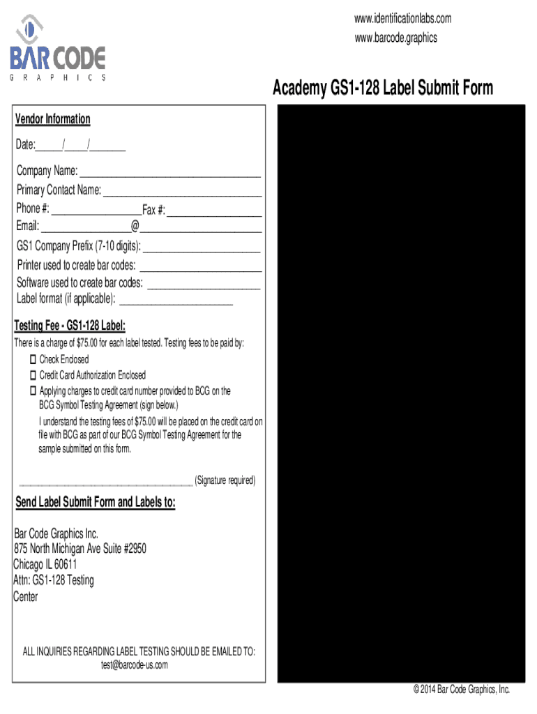 WWW.identificationlabs.com www.barcode.graphicsAcademy GS1128 Label Submit Form Vendor Information Date: / / Company Name: Primary Contact Name: Phone #: Fax #: Email: GS1 Company Prefix (710 digits):