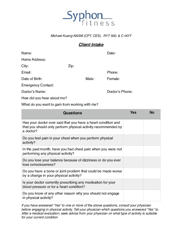 Michael KuangNASM (CPT, CES), RAT 500, & CIAYTClient Intake Name:Date:Home Address: City:Zip:Email:Phone:Date of Birth:Male:Female:Emergency Contact: Doctors Name:Doctors Phone:How did you hear about