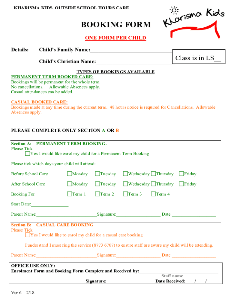 CHARISMA KIDS OUTSIDE SCHOOL HOURS PREBOOKING FORM ONE FORM PER CHILD Details:Child's Family Name: Child's Christian Name: Class is in LS TYPES OF BOOKINGS AVAILABLE PERMANENT TERM BOOKED CARE: Bookings