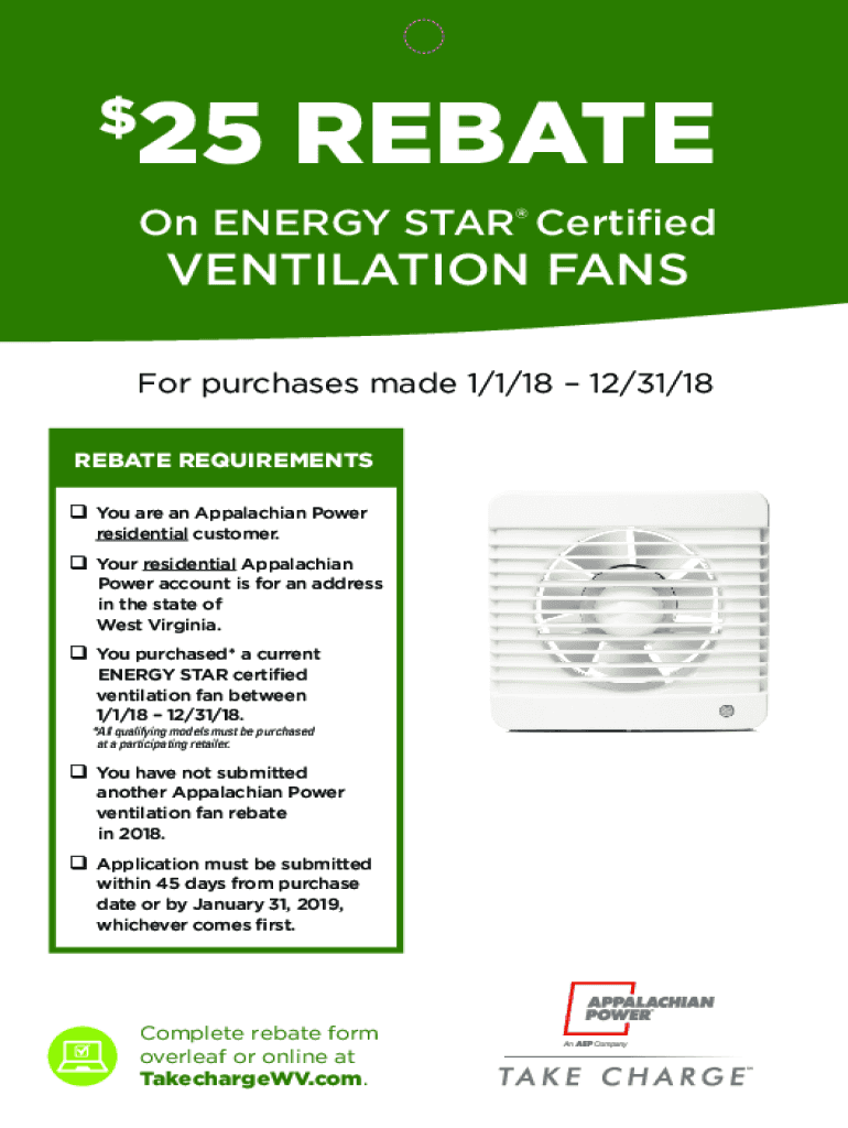25 Relation ENERGY STAR CertifiedVENTILATION Fans purchases made 1/1/18 12/31/18 REBATE REQUIREMENTS q You are an Appalachian Power residential customer.q Your residential Appalachian Power account