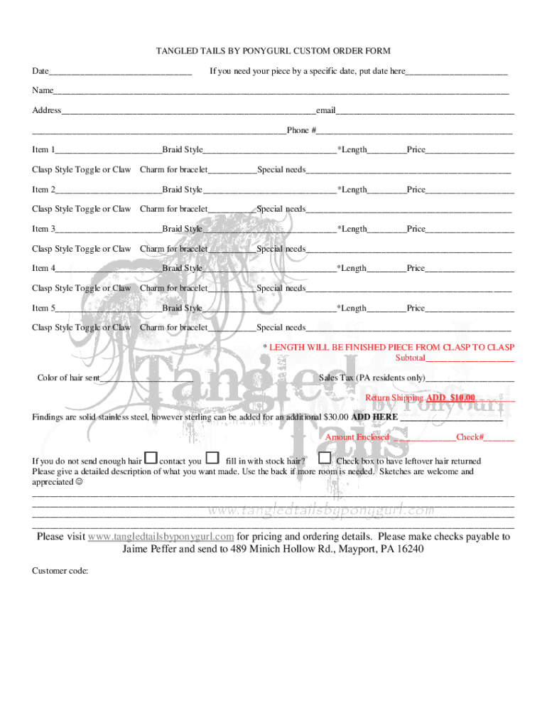 TANGLED TAILS BY PONYTAIL CUSTOM ORDER FORM Date If you need your piece by a specific date, put date here Name Address email Phone # Item 1 Braid Style *Length Price Clasp Style Toggle or Blanchard