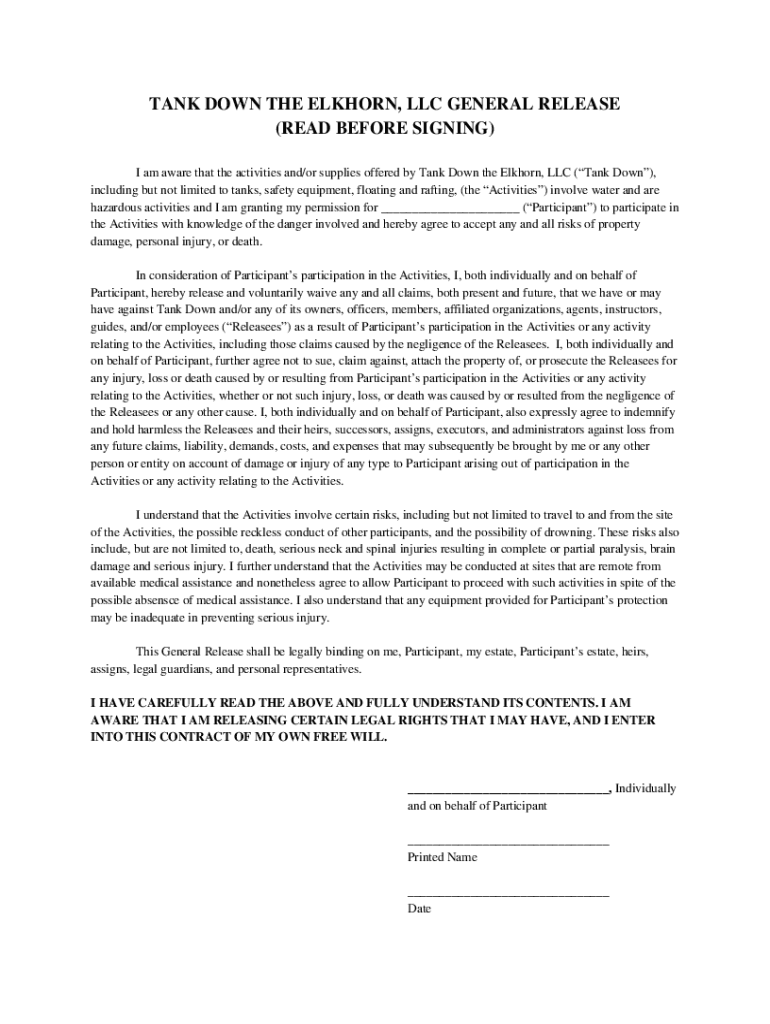 Get the free TANK DOWN THE ELKHORN, LLC GENERAL RELEASE (READ BEFORE SIGNING)