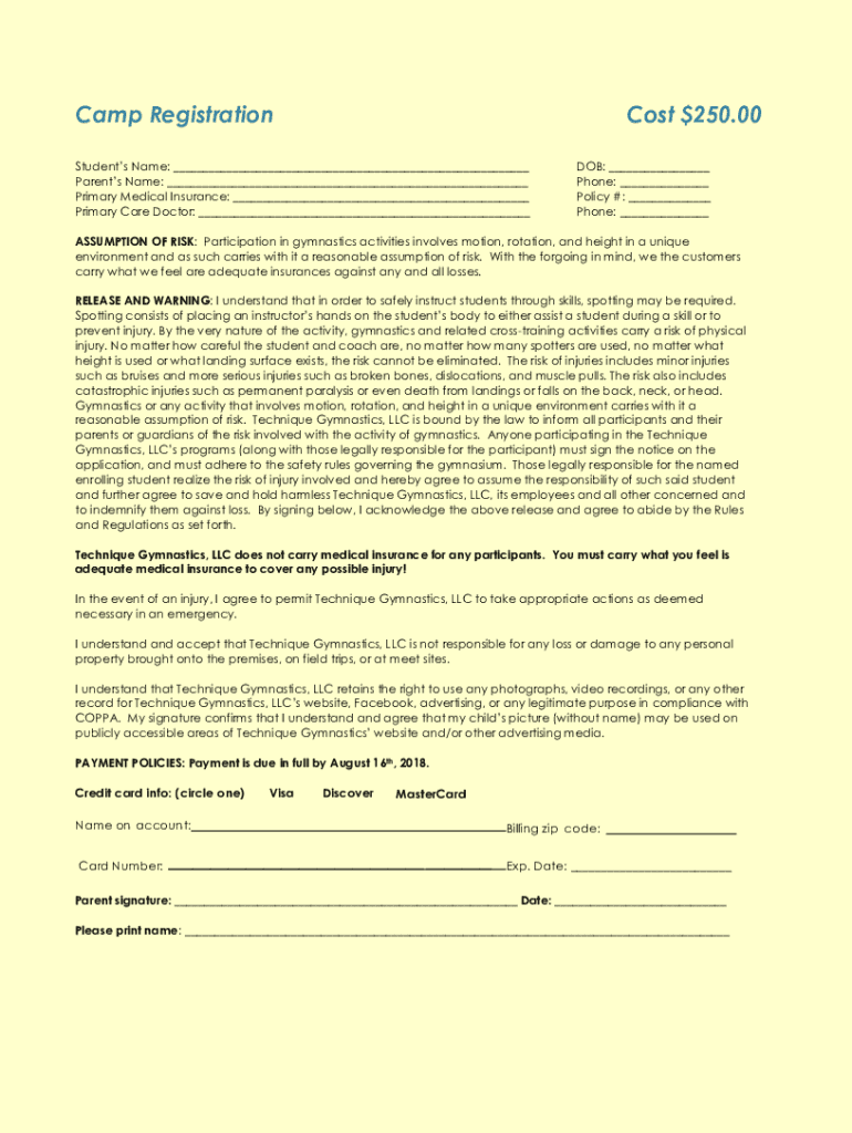 Camp Registrations $250.00Students Name: Parents Name: Primary Medical Insurance: Primary Care Doctor: DOB: Phone: Policy #: Phone: ASSUMPTION OF RISK: Participation in gymnastics activities involves