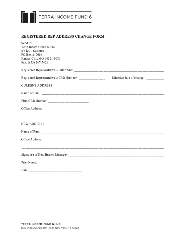 REGISTERED REP ADDRESS CHANGE FORM Send to: Terra Income Fund 6, Inc. c/o DST Systems PO Box 219686 Kansas City, MO 641219686 Fax: (855) 2477429 Registered Representatives Full Name: Registered Representatives