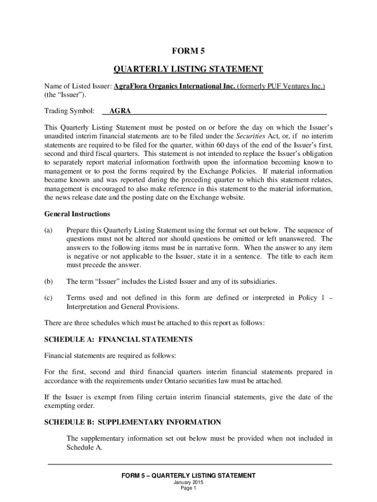 Name of Listed Issuer: Agra Flora Organics International Inc. (formerly PUF Ventures Inc.)